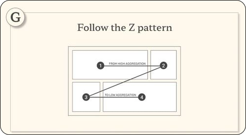 Aan G heb ik mij niet geheel gehouden. Heb verschillende lay-outs geprobeerd om een Z-patroon te krijgen. Echter werd de informatie er niet overzichtelijker van. Heb daarvoor veel meer gewerkt met kleuren om informatie te groeperen.